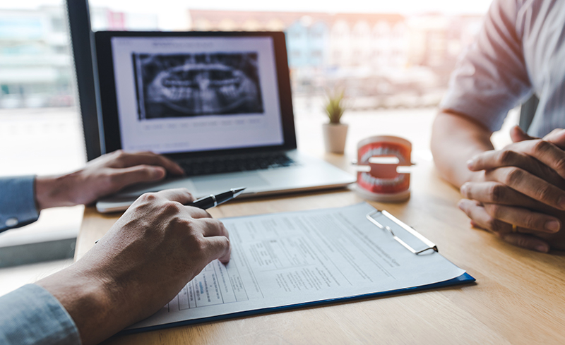 問診票をもとにドクターがヒアリングをおこないます。ヒアリング後、診察を行い、お口の中の写真、お顔の写真、デジタルレントゲン写真の撮影をおこないます。